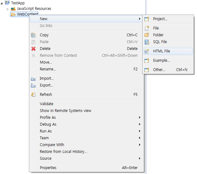 그럼 이제 최초의 HTML 파일을 만들어보자. index.html을 만들텐데 TestApp의 WebContent 아래에서 마우스 우클릭을 통해 HTML 파일을 생성할 수 있다.