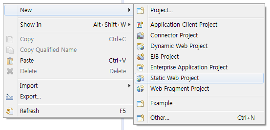 이제 첫 번째 프로젝트를 만들어 보자. Project Explorer 창에서 New->Static Web Project를 선택한다.