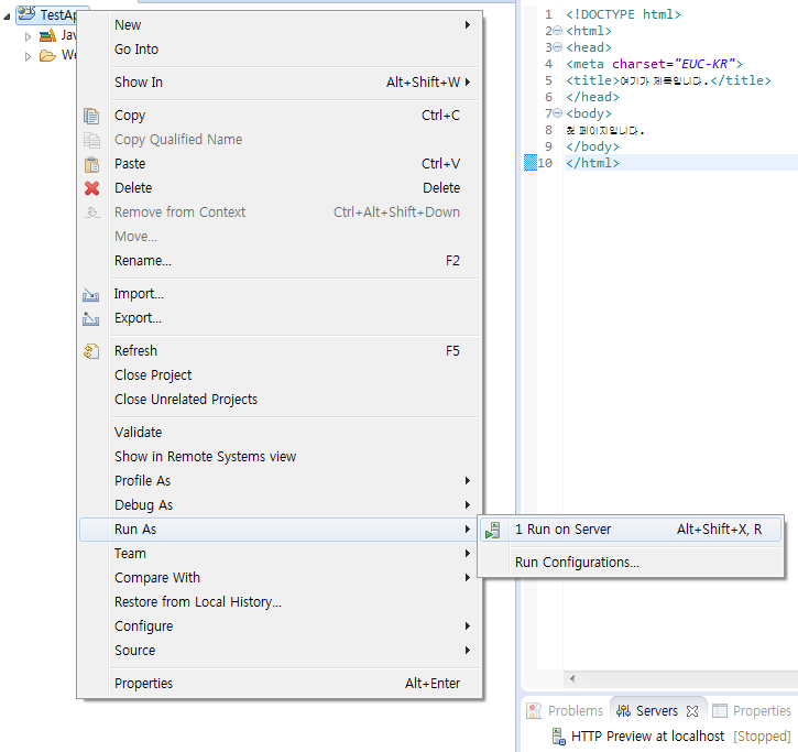 이제 실행해보자. Project Explorer에서 프로젝트 위에서 마우스 우클릭 --> Run As --> Run on Server를 클릭한다.