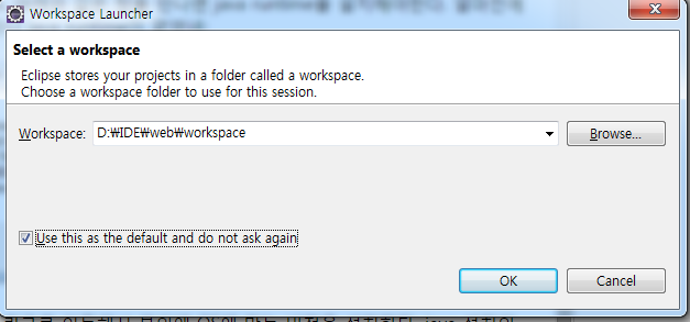 최초 실행을 하게 되면 workspace를 지정해야 한다. 이전에 만들어 놓은 디렉토리를 지정하자. 'Use this as the default and do not ask again'을 체크하자. 귀찮으니까 다시 묻지 말라는 이야기다. workspace는 이클립스 환경설정에서도 바꿀 수 있다.