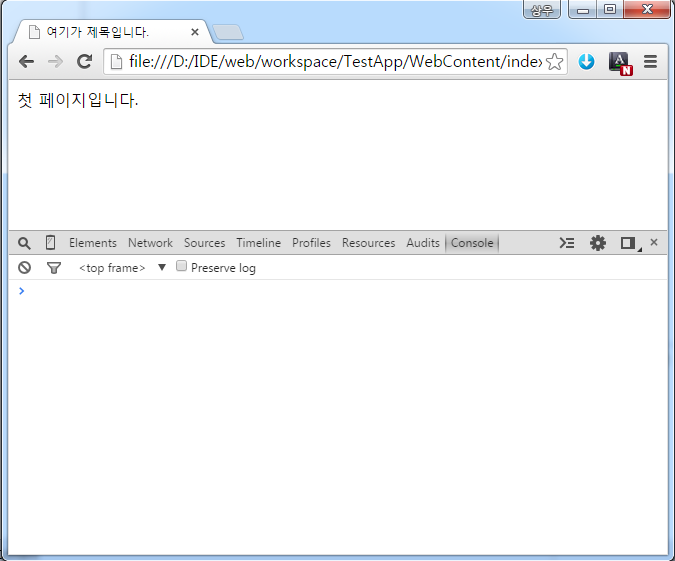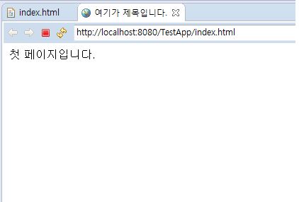 그럼 자동으로 이클립스 내의 Preview 서버가 구동되며 TestApp이 호스팅된다. 편집창에서 index.html의 결과를 아래와 같이 볼 수 있다.